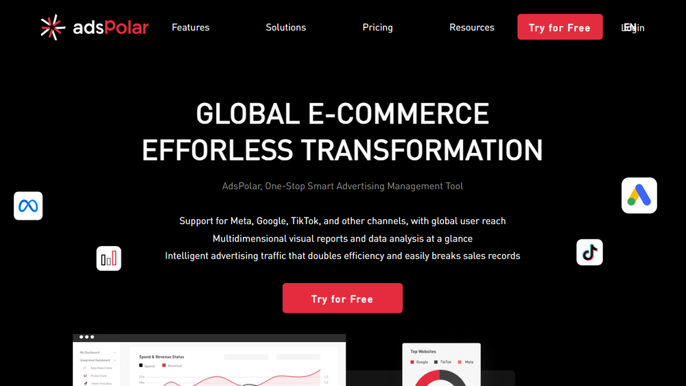 This webpage introduces an advanced Ad Automation Tool specifically engineered for global e-commerce businesses. The tool leverages artificial intelligence to streamline and optimize advertising efforts, aiming to enhance efficiency and effectiveness for online retailers operating on an international scale.