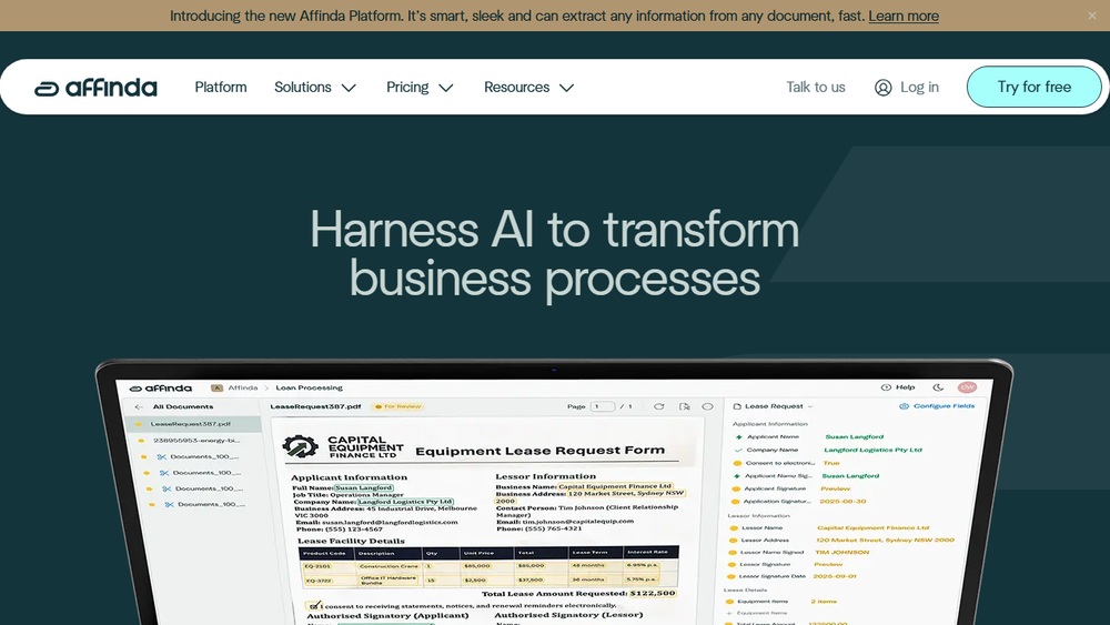 - Industry-Specific Solutions: Affinda offers tailored solutions for various industries, including banking and finance, government, healthcare, insurance, logistics, manufacturing, and recruitment technology. This industry focus ensures that their AI agents are optimized for the unique challenges and document types prevalent in each sector.