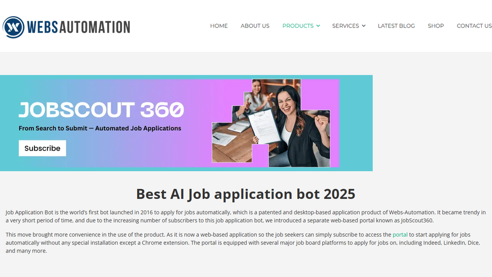 The webpage also highlights the "Best AI Job application bot 2025," suggesting that the product is either a leading solution in the market or is positioned to be one in the near future. The mention of "Webs-Automation" as the provider indicates a focus on automation technologies. The inclusion of video links suggests that potential users can learn more about the bot's capabilities through visual demonstrations. The overall message is one of efficiency, effectiveness, and a modern approach to job hunting in the age of artificial intelligence.