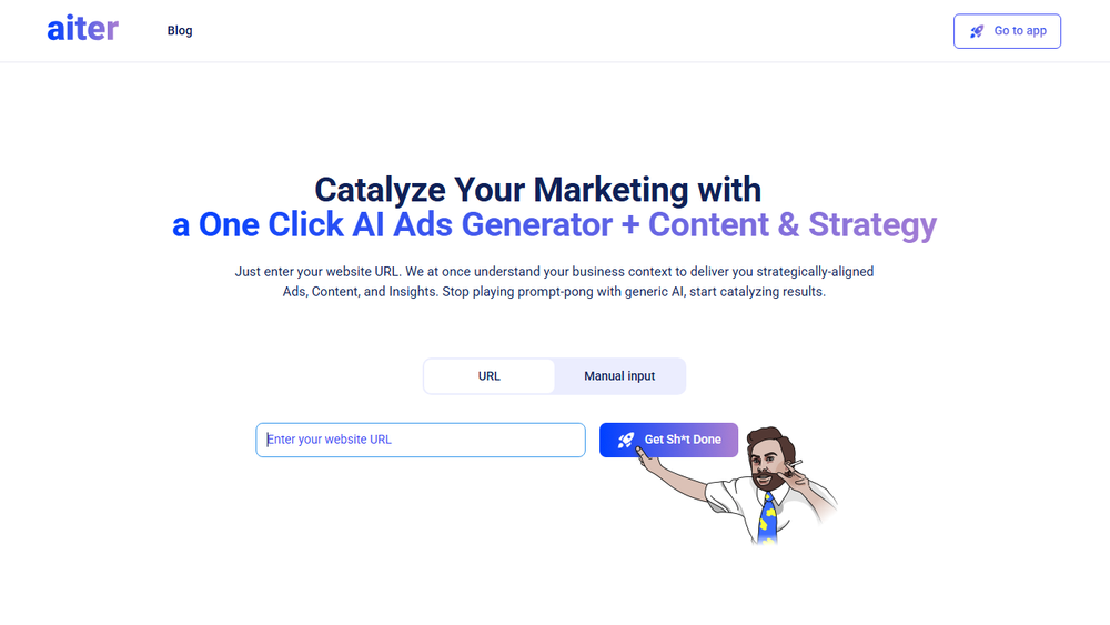 - One-Click AI Ads & Content Generation: Aiter bypasses the need for complex prompt engineering. It understands your business context from your website or a manual description to produce tailored marketing materials.