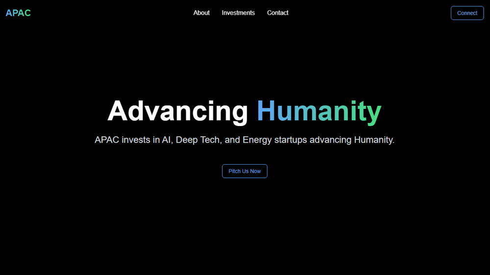 APAC is a forward-thinking investment firm dedicated to identifying and nurturing startups that are at the forefront of innovation and have the potential to significantly advance humanity. Our investment focus is strategically placed on three key sectors: Artificial Intelligence (AI), Deep Tech, and Energy. We believe these areas hold the most promise for transformative solutions that can address global challenges and shape a better future.