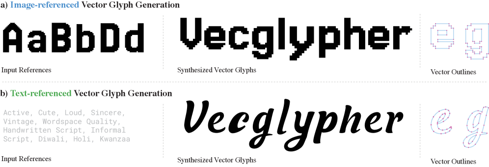 - Direct SVG Output: Unlike methods that generate raster images and then vectorize them, VecGlypher directly outputs SVG path data. This ensures that the generated glyphs are inherently editable, scalable, and free from rasterization artifacts, making them immediately usable in professional typography workflows.