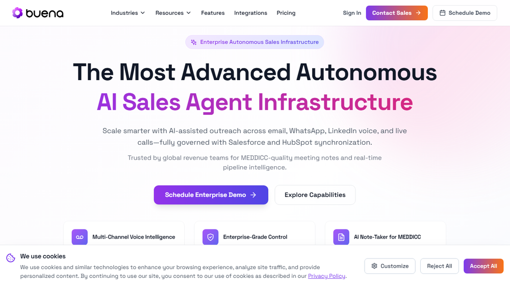 Buena AI stands out with its focus on programmable infrastructure, allowing for a level of customization rarely seen in AI sales tools. The integration of advanced features like the MEDDICC note-taker and multi-channel voice intelligence positions it as a powerful solution for complex sales environments. The platform's commitment to security and its ability to synchronize with leading CRMs further solidify its appeal to enterprise clients.