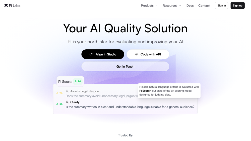 Pi Labs provides advanced AI solutions focused on scoring, evaluation, and quality assurance for artificial intelligence systems. Their platform aims to help businesses create and refine AI models that meet specific needs, ensuring higher performance and reliability.