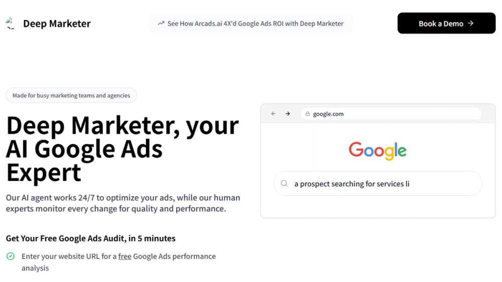 Deep Marketer is an advanced AI-powered platform designed to revolutionize how businesses manage and optimize their Google Ads campaigns. It leverages cutting-edge artificial intelligence to work tirelessly, 24/7, ensuring that your advertising efforts are constantly refined for maximum impact and efficiency. The core of Deep Marketer's offering is its AI agent, which is trained to analyze vast amounts of data, identify trends, and make real-time adjustments to bids, targeting, ad copy, and more. This continuous optimization process aims to improve key performance indicators such as click-through rates (CTR), conversion rates, and return on ad spend (ROAS).