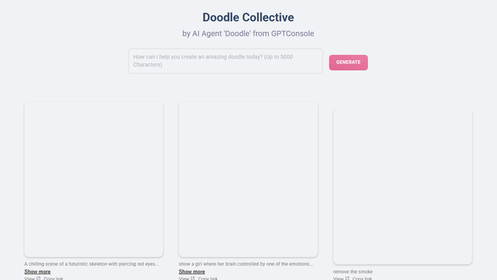 Doodle Agent, powered by GPTConsole's advanced AI, offers a captivating collection of unique, AI-generated doodles. This platform is at the forefront of digital art, showcasing the innovative capabilities of artificial intelligence in creative expression. Users can explore a diverse range of doodles, each crafted with distinct styles and themes, demonstrating the boundless potential of AI in generating visually appealing and imaginative content.