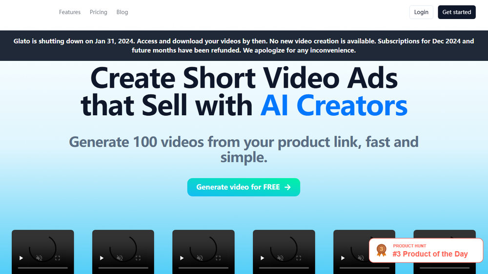 Note: The website content indicates that Glato AI is shutting down on January 31, 2024. Users are advised to access and download their videos by this date, as new video creation will no longer be available. Subscriptions for December 2024 and future months have been refunded.