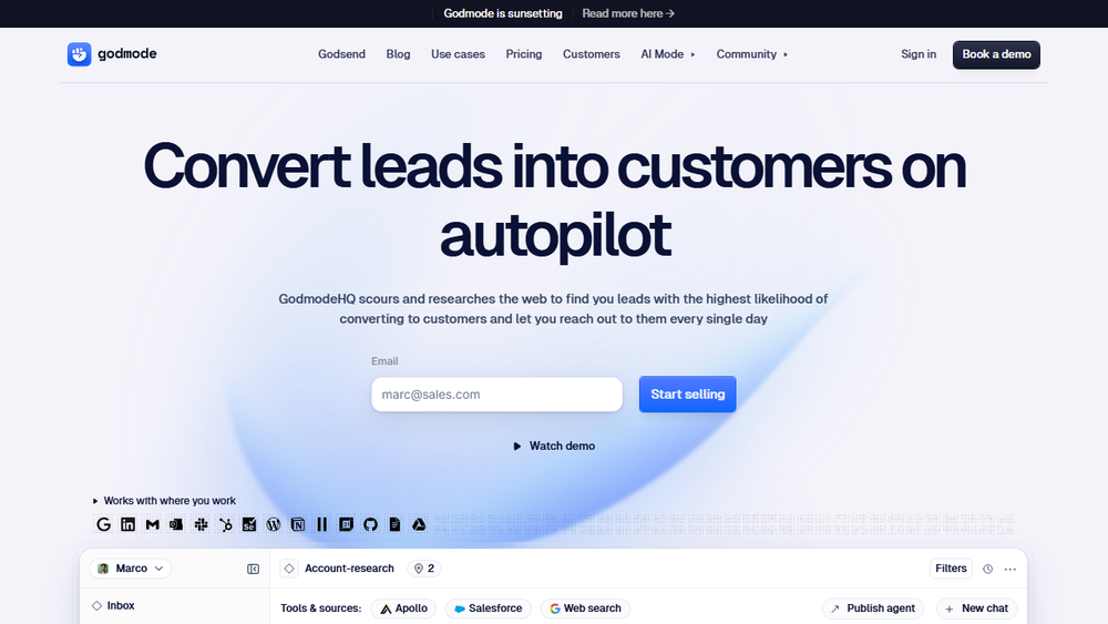 GodmodeHQ is an advanced AI-powered platform designed to revolutionize sales and marketing operations by automating business growth. It acts as a go-to-market teammate, working tirelessly to bring in new opportunities on autopilot, allowing businesses to scale effectively without constant manual intervention.