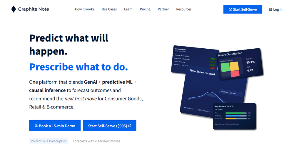Graphite Note is a cutting-edge Decision Intelligence Platform designed to empower data teams with no-code solutions for forecasting outcomes and recommending optimal actions. The platform uniquely integrates Generative AI (GenAI), predictive Machine Learning (ML), and causal inference to provide a comprehensive approach to decision-making. This powerful combination allows businesses to not only understand past trends but also predict future scenarios with high accuracy and identify the most effective strategies to achieve their goals.