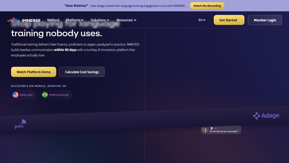 IMMERSE is a cutting-edge language training platform designed to revolutionize how organizations approach corporate language learning. It addresses the shortcomings of traditional methods, which often result in theoretical proficiency without practical application. IMMERSE leverages artificial intelligence and immersive technologies to build confident, real-world communicators within a remarkably short timeframe, typically 90 days.