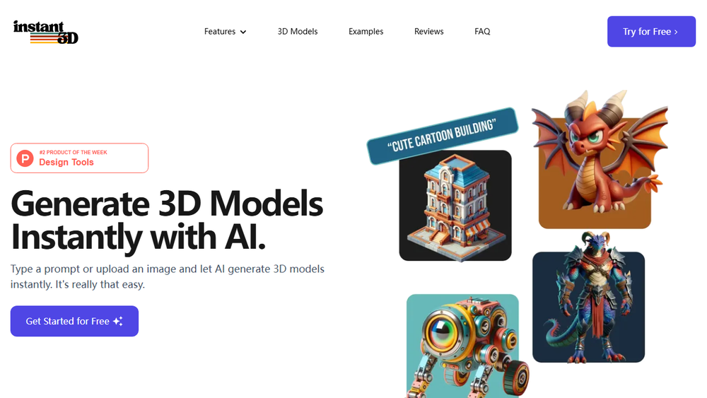 Instant 3D AI is a cutting-edge platform that simplifies the process of 3D modeling through the power of artificial intelligence. It offers a user-friendly experience, making 3D creation accessible to both beginners and experienced professionals. The platform's core functionality revolves around generating 3D models from various inputs, including text prompts and images. This allows users to quickly bring their ideas to life without the steep learning curve often associated with traditional 3D software.