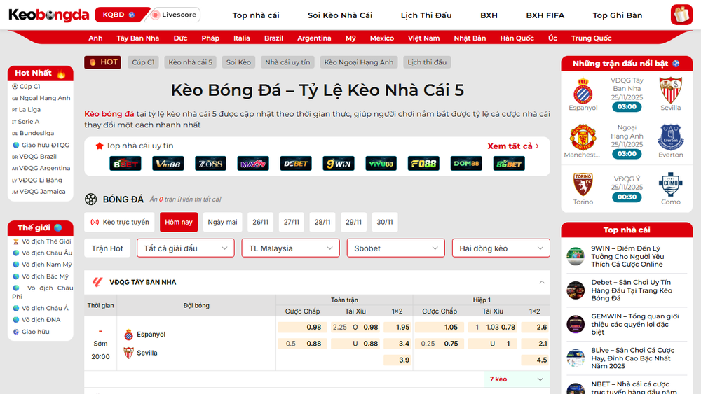 Trang web "Kèo Bóng Đá" cung cấp thông tin toàn diện về tỷ lệ kèo nhà cái, cập nhật trực tuyến liên tục và nhanh chóng cho người hâm mộ bóng đá và những người chơi cá cược. Nền tảng này tập trung vào việc mang đến dữ liệu chính xác và kịp thời về các trận đấu bóng đá trên toàn thế giới, giúp người dùng đưa ra quyết định sáng suốt.