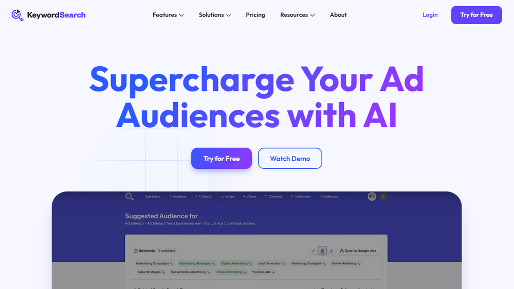- Seamless Google & YouTube Ad Sync: Once an optimal audience is identified, KeywordSearch offers one-click synchronization to Google Ads. This eliminates the tedious process of manual audience creation within ad platforms, allowing users to deploy their AI-generated audiences instantly and efficiently.