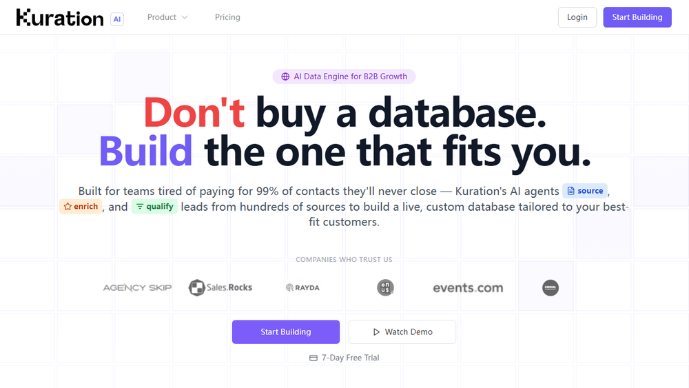 Instead of navigating through endless filters and dropdowns, users can simply describe their ideal customer in natural language. Kuration AI's intelligent agents then go to work, sourcing, enriching, and verifying the data from a multitude of sources. This process results in a dynamic, up-to-date database that is precisely tailored to the user's specific needs. The platform's ability to integrate with popular tools ensures that this valuable data can be seamlessly incorporated into existing sales and marketing stacks, driving efficiency and effectiveness.