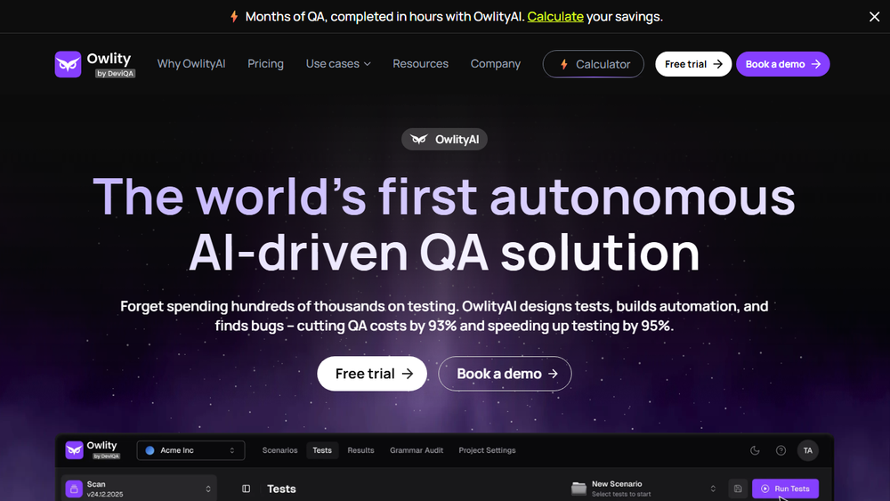 OwlityAI presents itself as a revolutionary solution in the realm of Quality Assurance (QA) testing, aiming to completely replace human QA departments with its advanced AI capabilities. The platform emphasizes its ability to automate the entire QA process, from test design and automation to bug detection, thereby drastically reducing operational costs and accelerating testing timelines.
