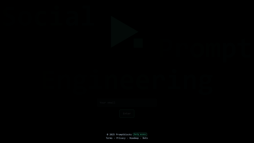 - AI Writing Tools: The presence of an email input field and a call to action like 'Enter' suggests a user onboarding process, likely leading to access to various AI-powered writing tools. The meta description "Social prompt engineering" and the title "Promptblocks" strongly indicate a focus on text-based AI interactions.
