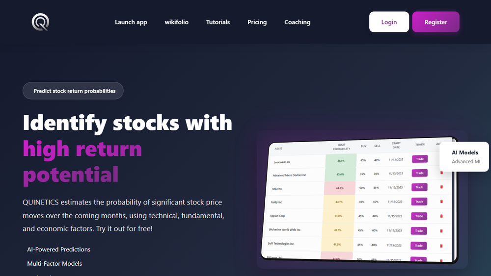 - AI-Powered Probability Predictions: QUINETICS utilizes advanced machine learning algorithms to estimate the likelihood of substantial stock price changes over the coming months. This data-driven approach aims to equip users with insights into potential high-return opportunities.