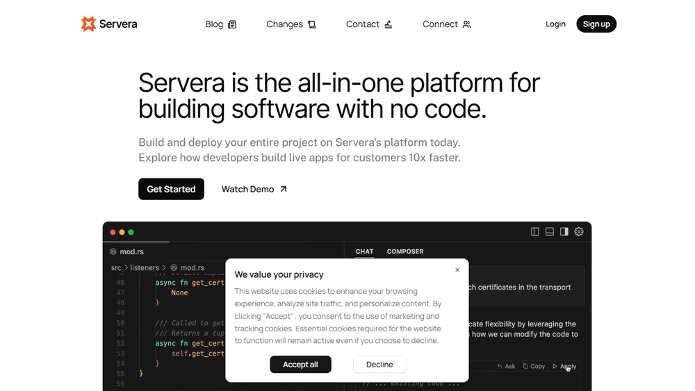 - AI-Powered Development: Servera integrates AI agents to assist in various stages of development, from initial design to deployment. This allows users to conceptualize and build complex applications with unprecedented speed and efficiency.