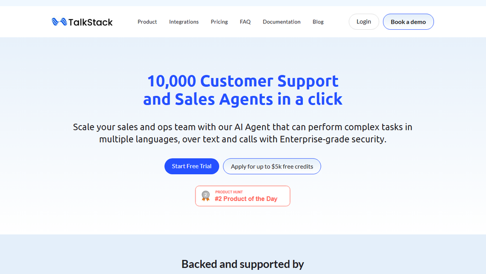 TalkStack AI is a cutting-edge platform that leverages advanced AI agents to revolutionize customer support and sales operations. The core offering is an AI agent, named 'Joy', designed to handle a wide array of complex tasks across both text and voice channels, supporting multiple languages with enterprise-grade security. This allows businesses to scale their teams instantly, deploying up to 10,000 agents with a single click.