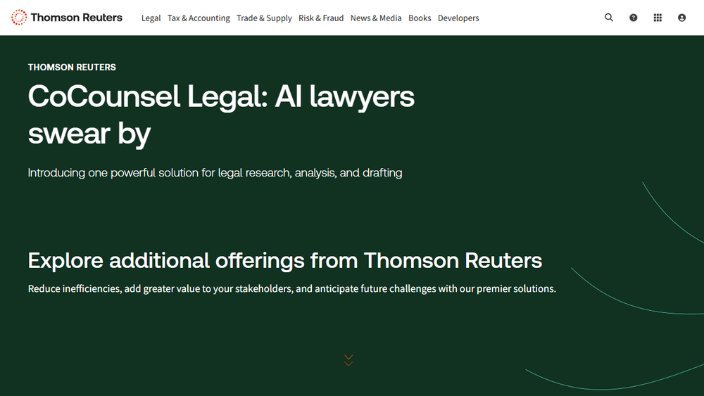 In the legal domain, Thomson Reuters provides essential tools for legal professionals, such as Westlaw, a premier legal research platform, and Practical Law, which offers expert-written legal know-how. They also offer solutions for law firms to manage their practices, enhance client service, and improve operational efficiency. Their legal AI solutions, like CoCounsel Legal, are designed to accelerate complex legal work, integrating research, drafting, and document analysis into a single, intuitive experience.