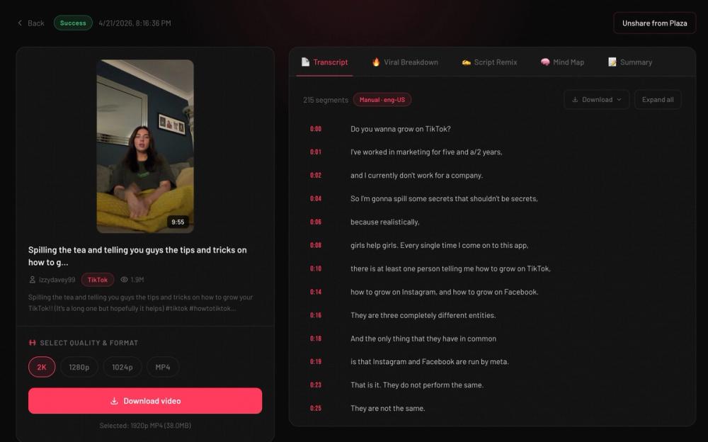 - Content Creators: Analyze successful TikToks to understand what makes them go viral, improve their own video scripts, and find inspiration for new content.