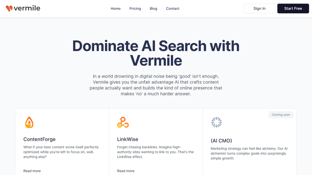 Vermile is a suite of AI-powered tools designed to give businesses a significant advantage in content creation and online presence building. The platform aims to automate and optimize the process of crafting content that resonates with audiences and establishes a strong online footprint, making it harder for competitors to say 'no' to opportunities.