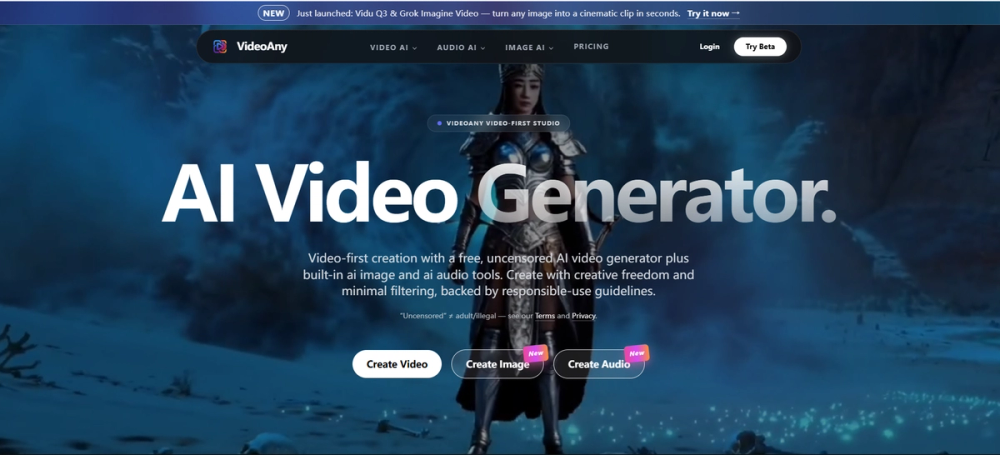 VideoAny is an uncensored, video-first AI studio offering immense creative freedom with minimalfiltering. It combines powerful AI video,image, and audio generators into one platform. Supporting topmodels like Kling 3.0 and Vidu Q3, it lets creators easily turn text or images into viral content.