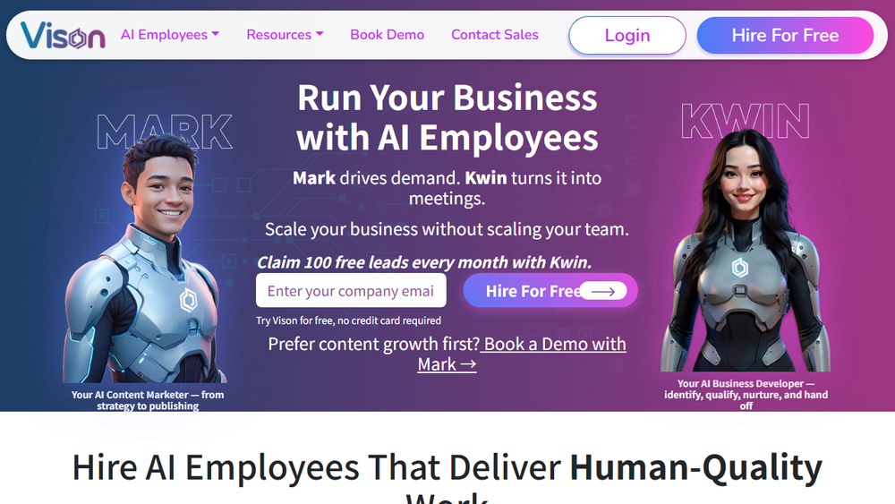 Vison AI positions itself as a revolutionary platform that provides businesses with 'AI Employees' designed to deliver human-quality work. The core promise is to automate repetitive tasks, enable effortless scaling, and allow businesses to focus on growth without the need to increase their human headcount. This approach aims to significantly reduce operational costs and increase efficiency.
